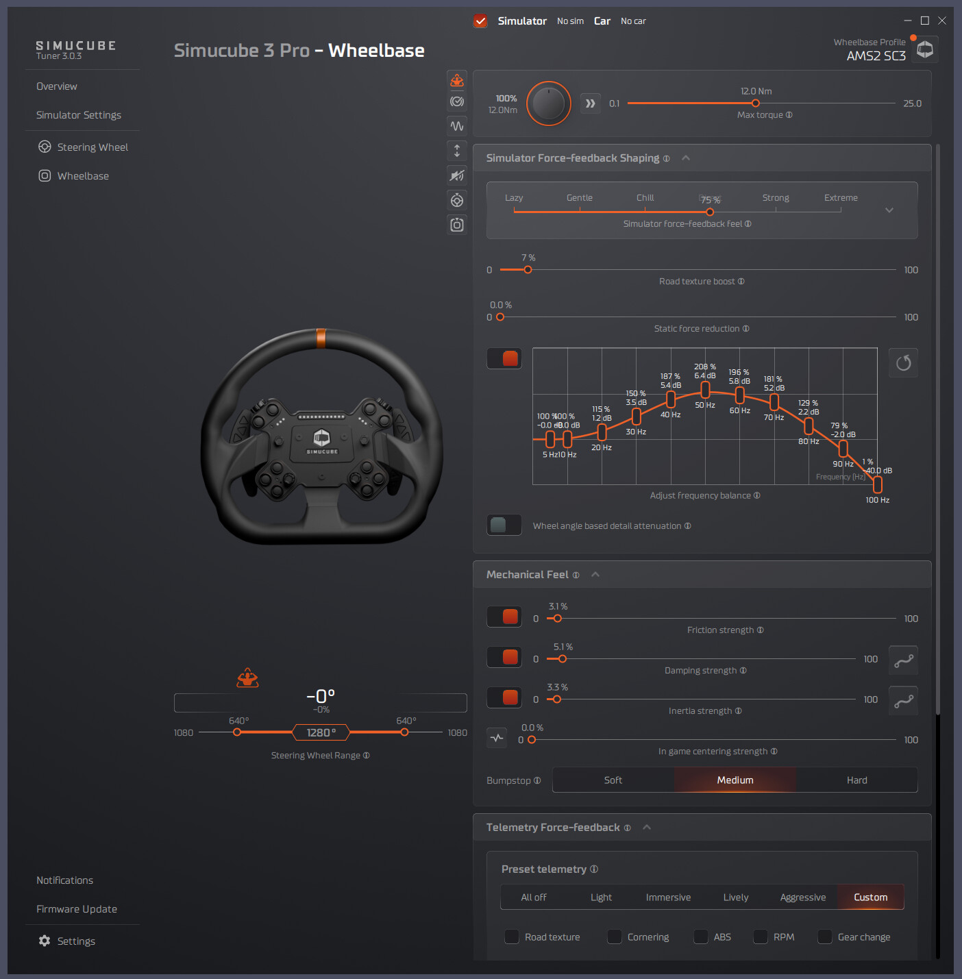 AC Evo: Out of the box, Evo’s ffb can be pretty dull. Since Kunos added the Road Effects slider, it’s better however, the AC titles have always been prone to producing very grainy feeling surface effects. With the FFB EQ in SC Tuner, it’s easy to remove the high frequency details while boosting the softer mid-range ones, or even the suspension effects.