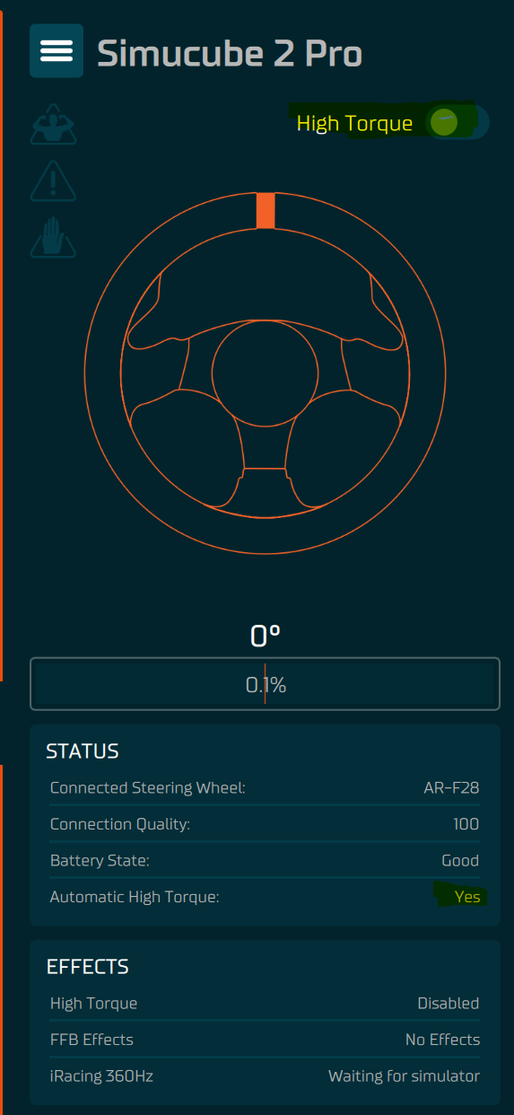 Sometimes the tuner deactivates High Torque Mode on its own. I’ve had this happen a few times, but until now only in offline mode. Now it’s happened to me in multiplayer. A whole race without FFB ![]()